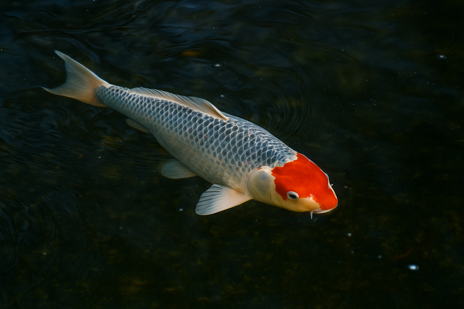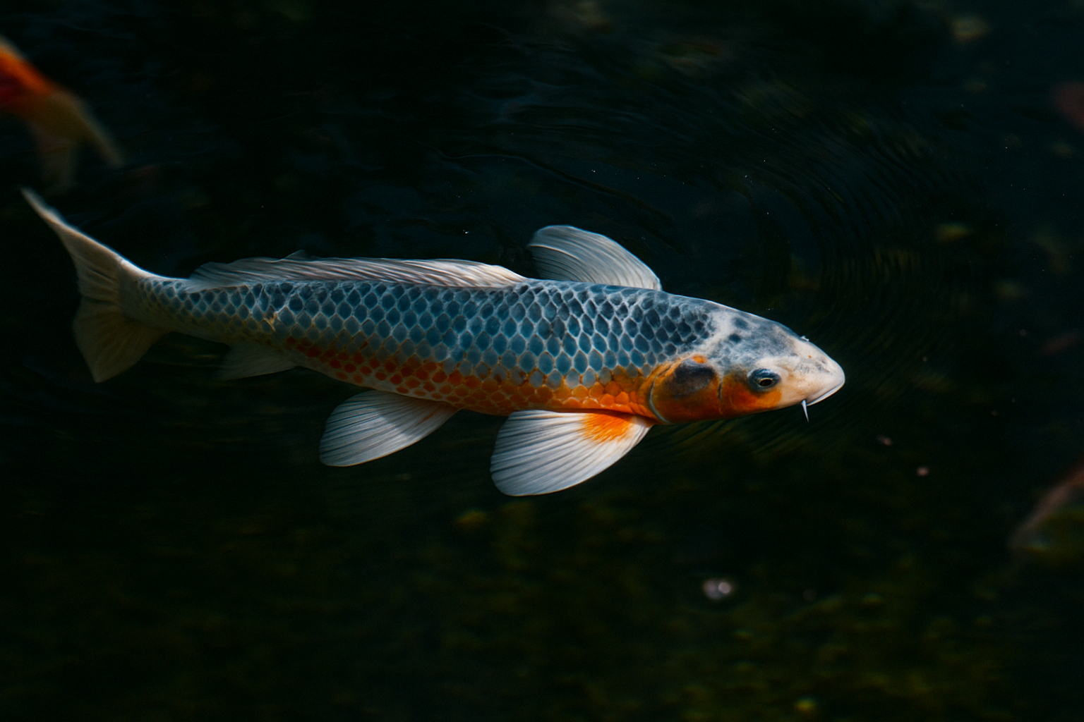 Asagi are classic blue-gray koi with a reticulated net pattern on the back and warm red/orange along the belly and fins.